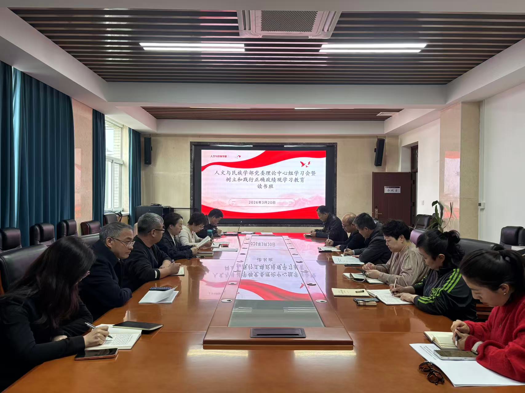 为深入学习贯彻党中央关于在全党开展树立和践行正确政绩观学习教育的决策部署,全面落实自治区党委、校党委工作要求,人文与民族学部于2026年3月20日召开了党委理论学习中心组(扩大)会议暨树立和践行正确政绩观学习教育读书班,开班式由杜建录部长主持。